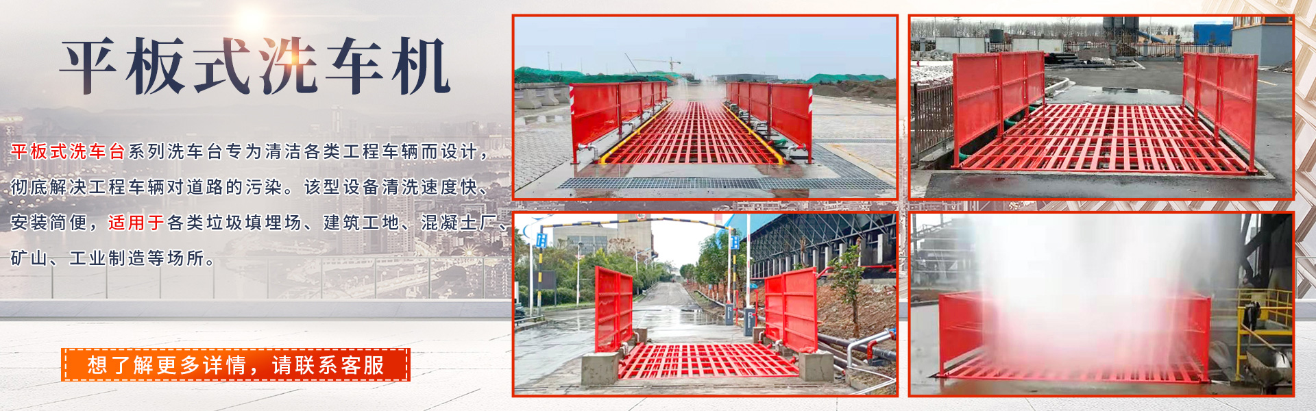 我司生產(chǎn)的工程洗車(chē)機(jī),能有效地解決了施工場(chǎng)地的揚(yáng)塵和對(duì)路面的污染,該設(shè)備利用多方位高壓水槍對(duì)輪胎及底盤(pán)部位進(jìn)行高壓沖洗,從而達(dá)到將車(chē)輪及底盤(pán)洗凈的效果,打到各部門(mén)上路的要求,把施工場(chǎng)地的泥沙擋在了門(mén)口以?xún)?nèi)…